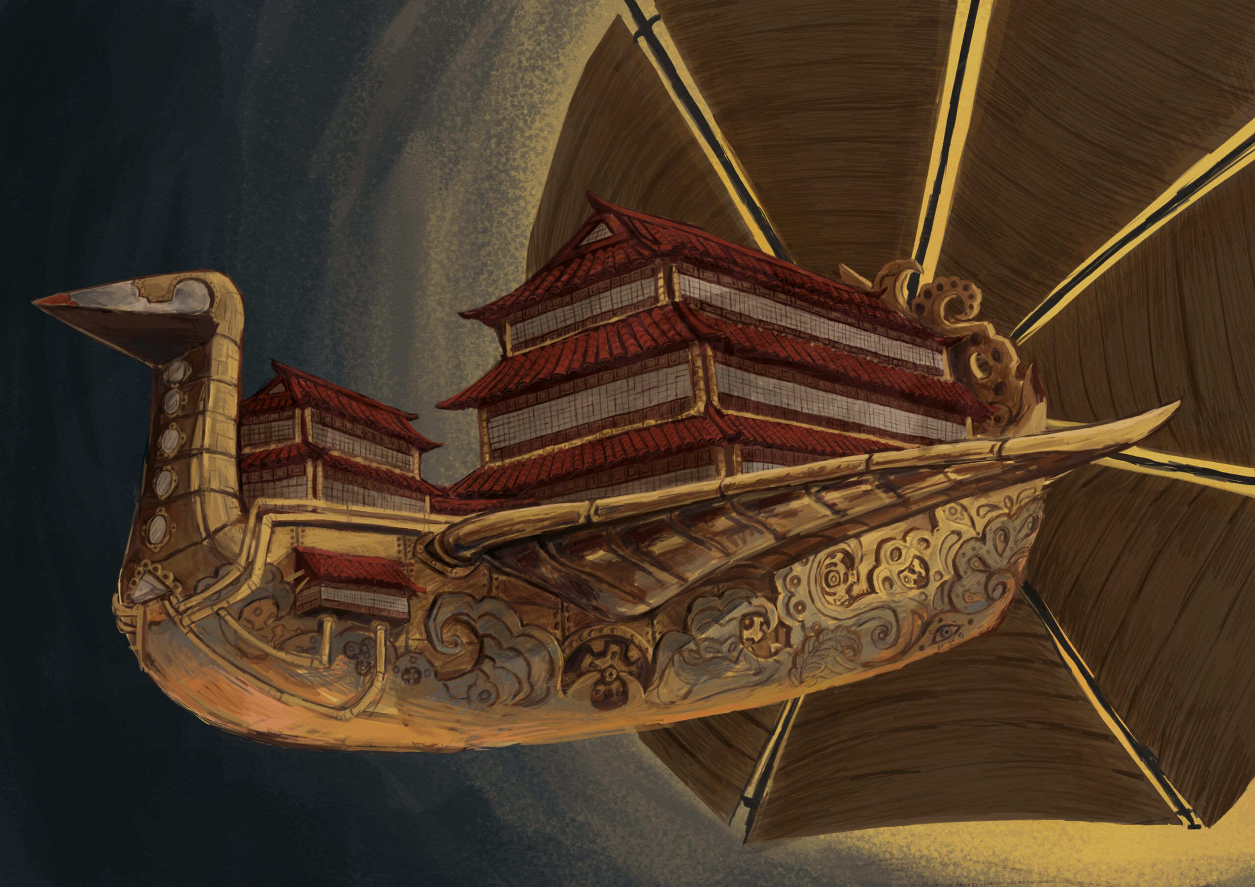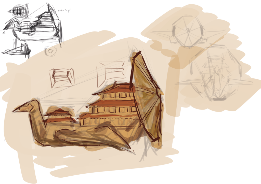 [The Flying Craine] is the spacecraft of this fraction. It’s based on origami paper cranes and ancient Japanese trading ships. I decided to give it a solar sail since this fraction has little means and needs to be as resourceful as possible.