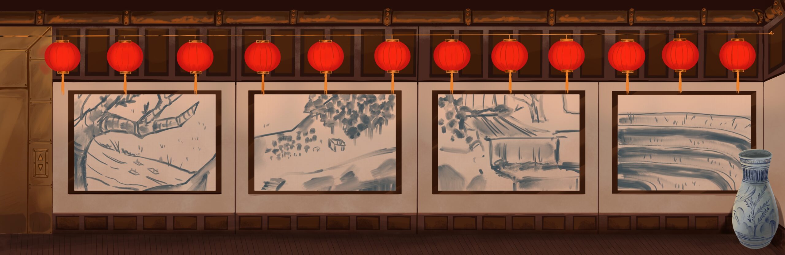 In the picture below you can see the concept of the entrance hall with the elevator. Our story was set during a festival which is why there are lanterns hanging from the wall. The paintings and vase are based on traditional Asian ink paintings and ceramic art. Even here you can see the steampunk core of the fraction, the ceiling is propped with metal pipes, and the elevator door and frame is made from brass.
