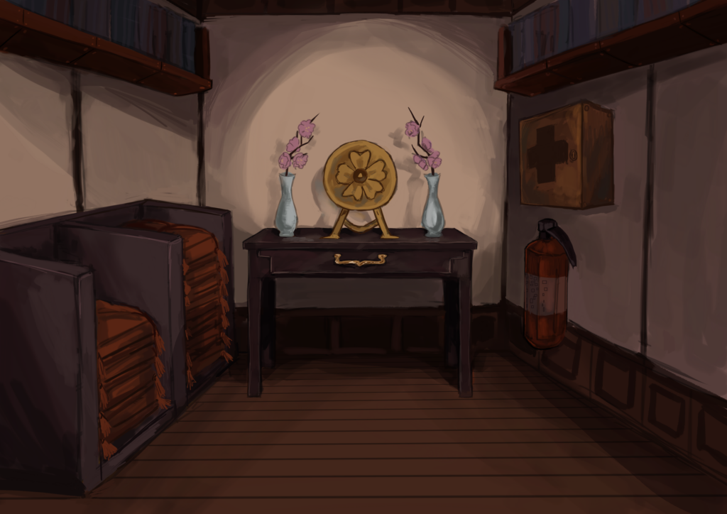This is a concept of the end of one of the halls. The must haves here were the fire extinguisher, first-aid-box and the camera (golden circular ornament in the middle). The furniture and feel of the environment is based on ancient Asia but things such as material were made up on the steampunk aspect of it.